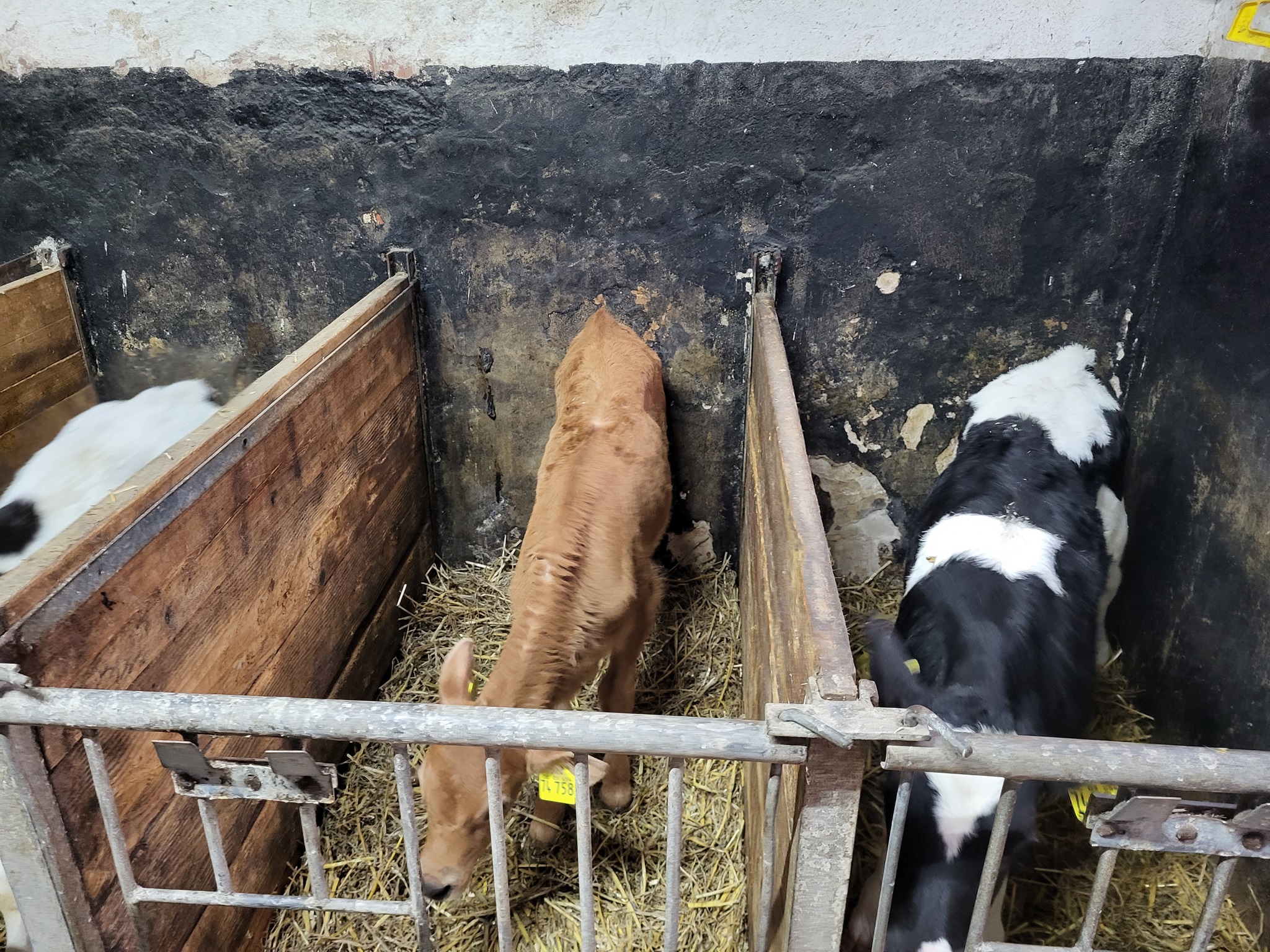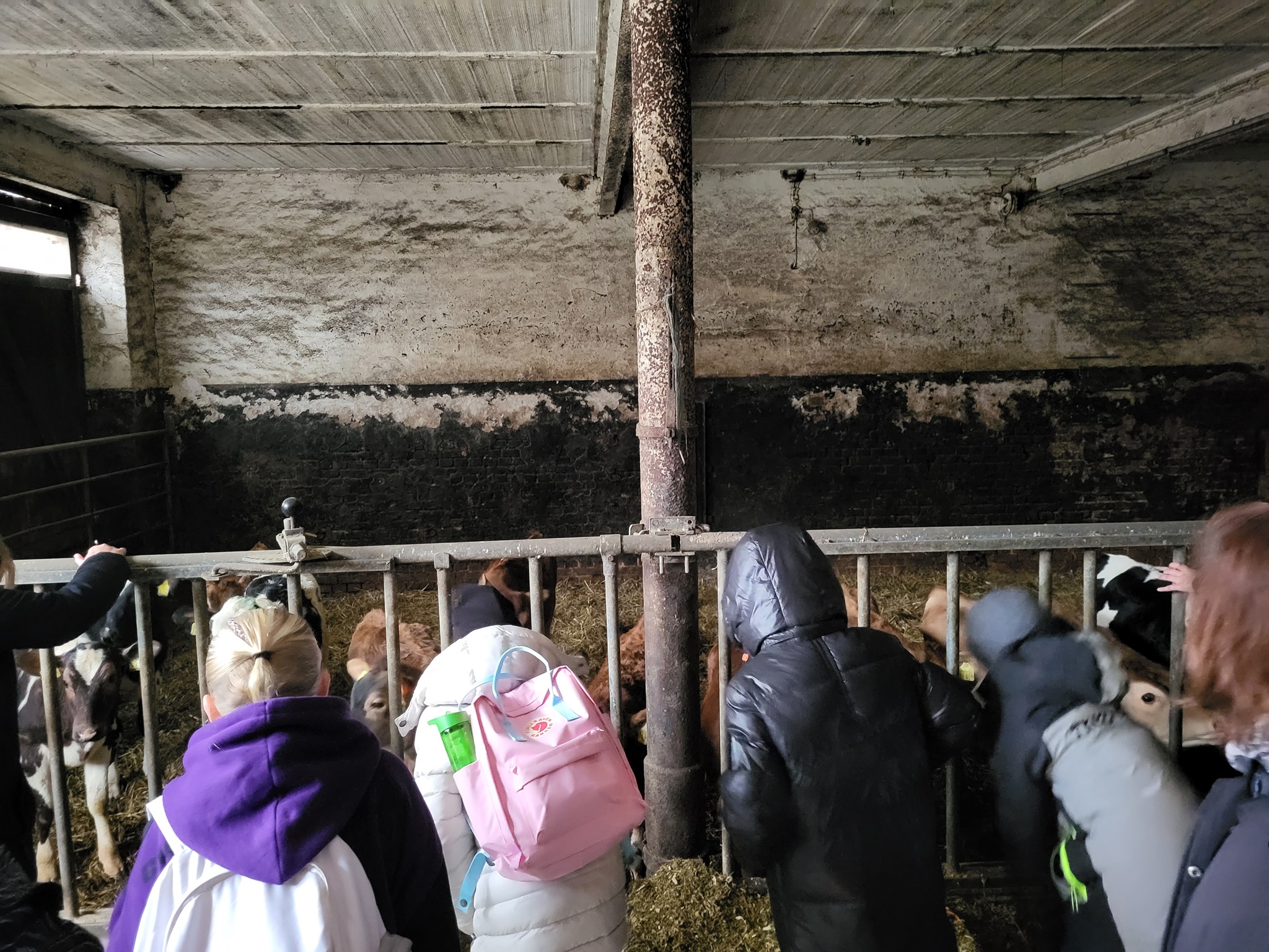 Nach einem kleinen Fußmarsch wurde wir sehr freundlich von Frau Ringe empfangen. Es ging auch gleich mit einem Highlight los. Alle Schülerinnen und Schüler durften sich zunächst die Kälbchen ansehen und auch streicheln.