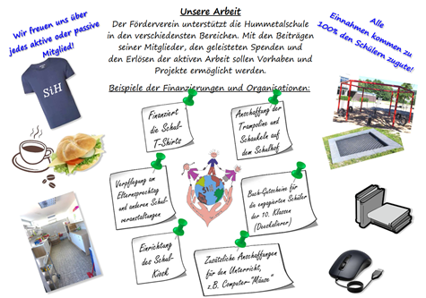 Wir, der Förderverein der Schule im Hummetal e.V. unterstützen immer dort, wo entweder keine finanziellen Mittel mehr zur Verfügung stehen oder mit angepackt werden muss.Dies ermöglichen uns die Mitgliedsbeiträge, geleistete Spenden, Erlöse der aktiven Arbeit und natürlich die Mithilfe der Eltern. Damit können wir Vorhaben und Projekte an der Schule ermöglichen und umsetzten. Weiter möchten wir die Zusammenarbeit zwischen Elternhaus und Schule fördern, sowie mit den Schulelternräten und Schülervertretungen zusammenarbeiten und diese unterstützen.